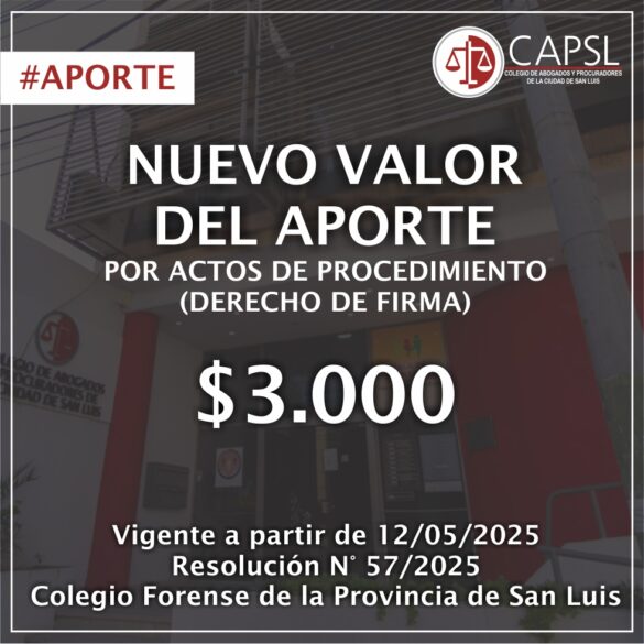 📢 Nuevo valor del aporte por derecho de firma El Colegio Forense de la Provincia de San Luis estableció, mediante...