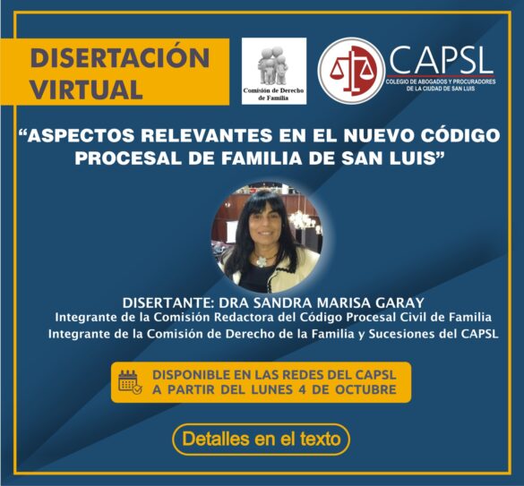 El CAPSL invita a la disertación virtual “Aspectos Relevantes en el Nuevo Código Procesal de Familia de San Luis”, organizada...