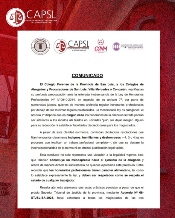 📢 COMUNICADO OFICIAL El Colegio Forense de la Provincia de San Luis, junto a los Colegios de Abogados y Procuradores...
