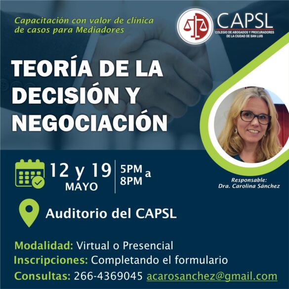 Te invitamos a participar de la capacitación “Teoría de la Decisión y Negociación”, dictada por la Dra. Carolina Sánchez, la...
