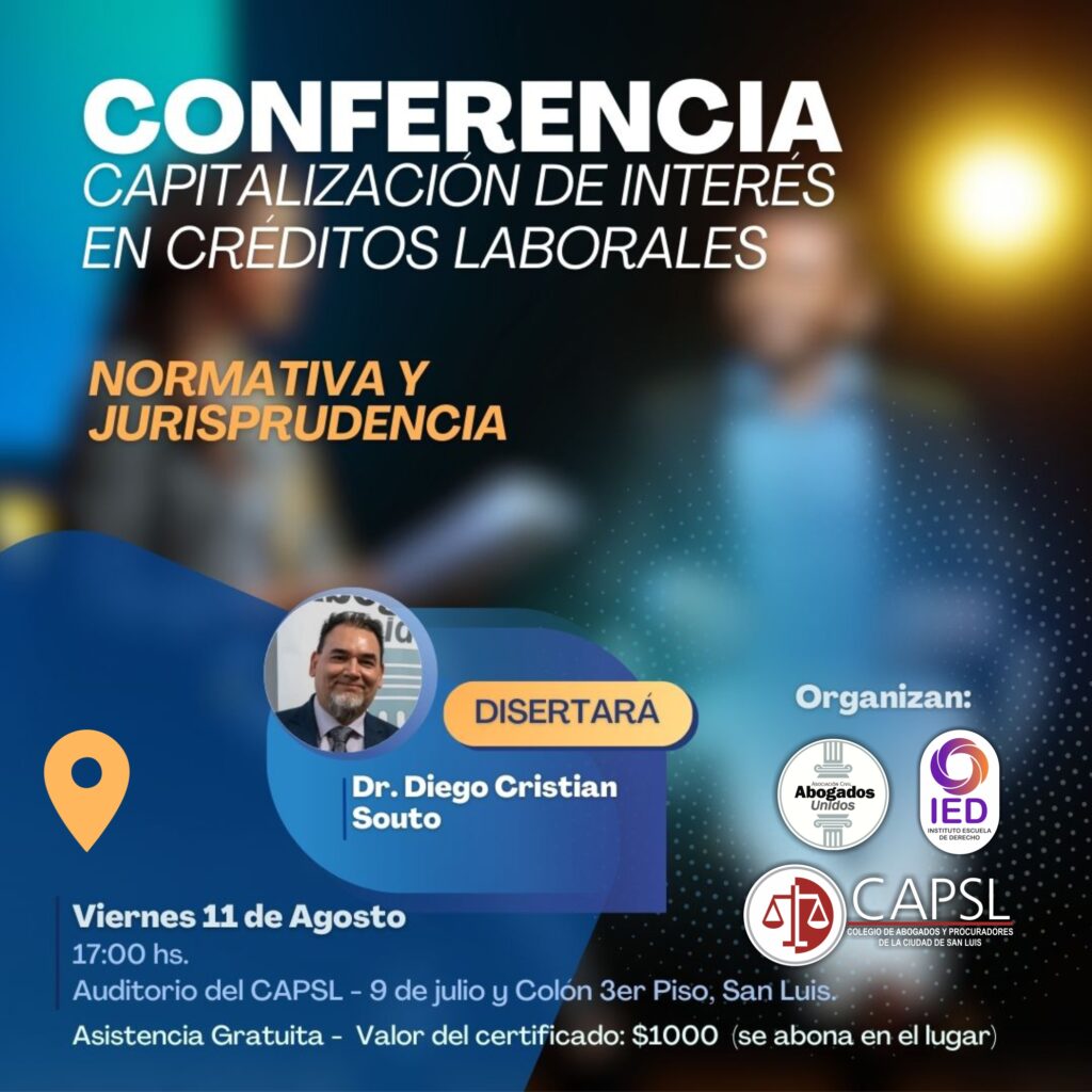 El Colegio de Abogados y Procuradores de San Luis se complace en invitarlos a participar de la conferencia “Capitalización de Interés en Créditos Laborales”. Este evento se llevará a cabo el día viernes 11 de agosto a las 17 horas en el Auditorio del CAPSL.