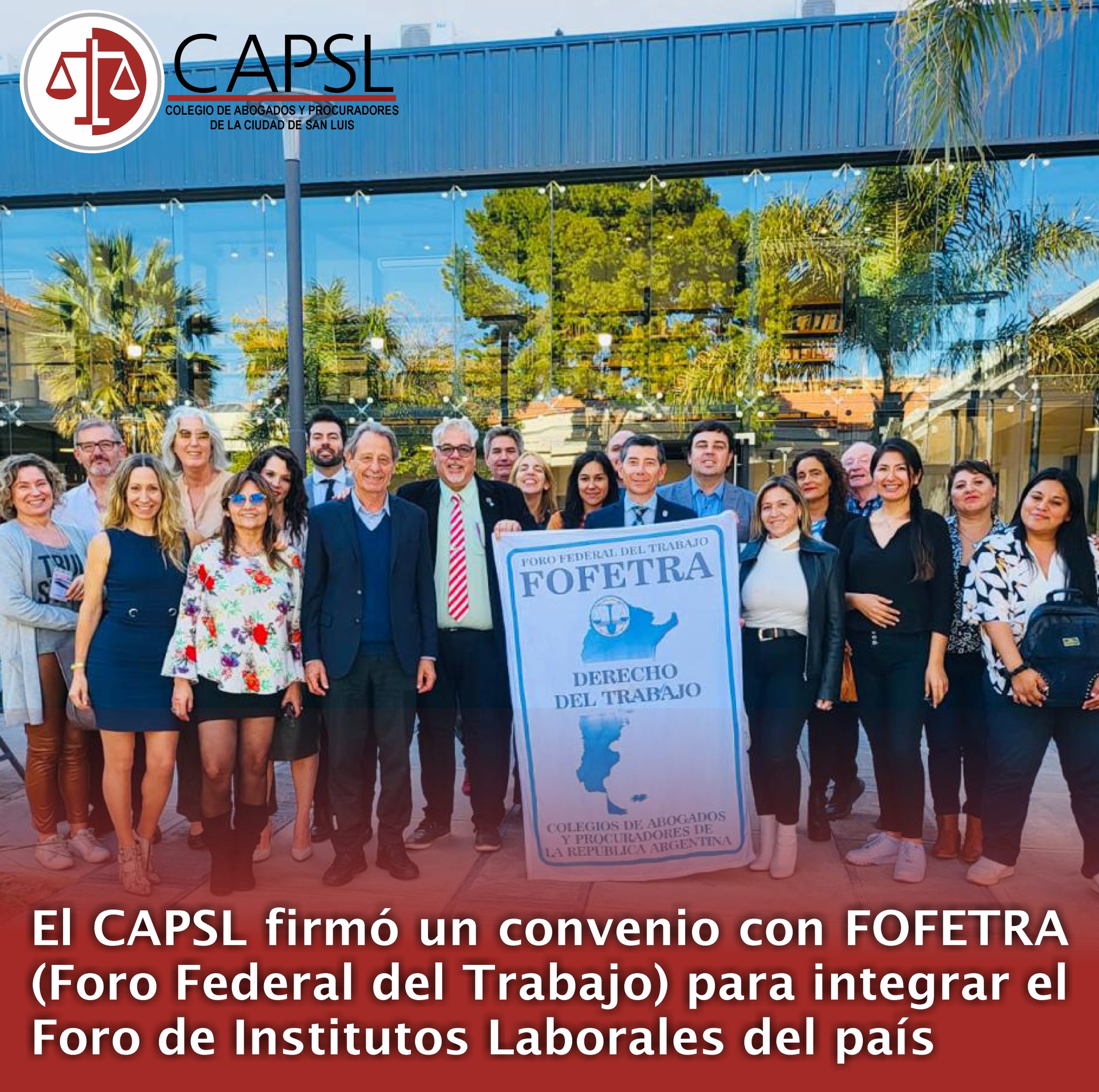 Este viernes en La Rioja, en el marco del IV Congreso Nacional de Derecho de Trabajo, el CAPSL firmó con FOFETRA (Foro Federal del Trabajo) el respectivo convenio para poder integrar el Foro de Institutos y Comisiones de Derecho del Trabajo de Colegios de Abogados y Procuradores de la República Argentina.