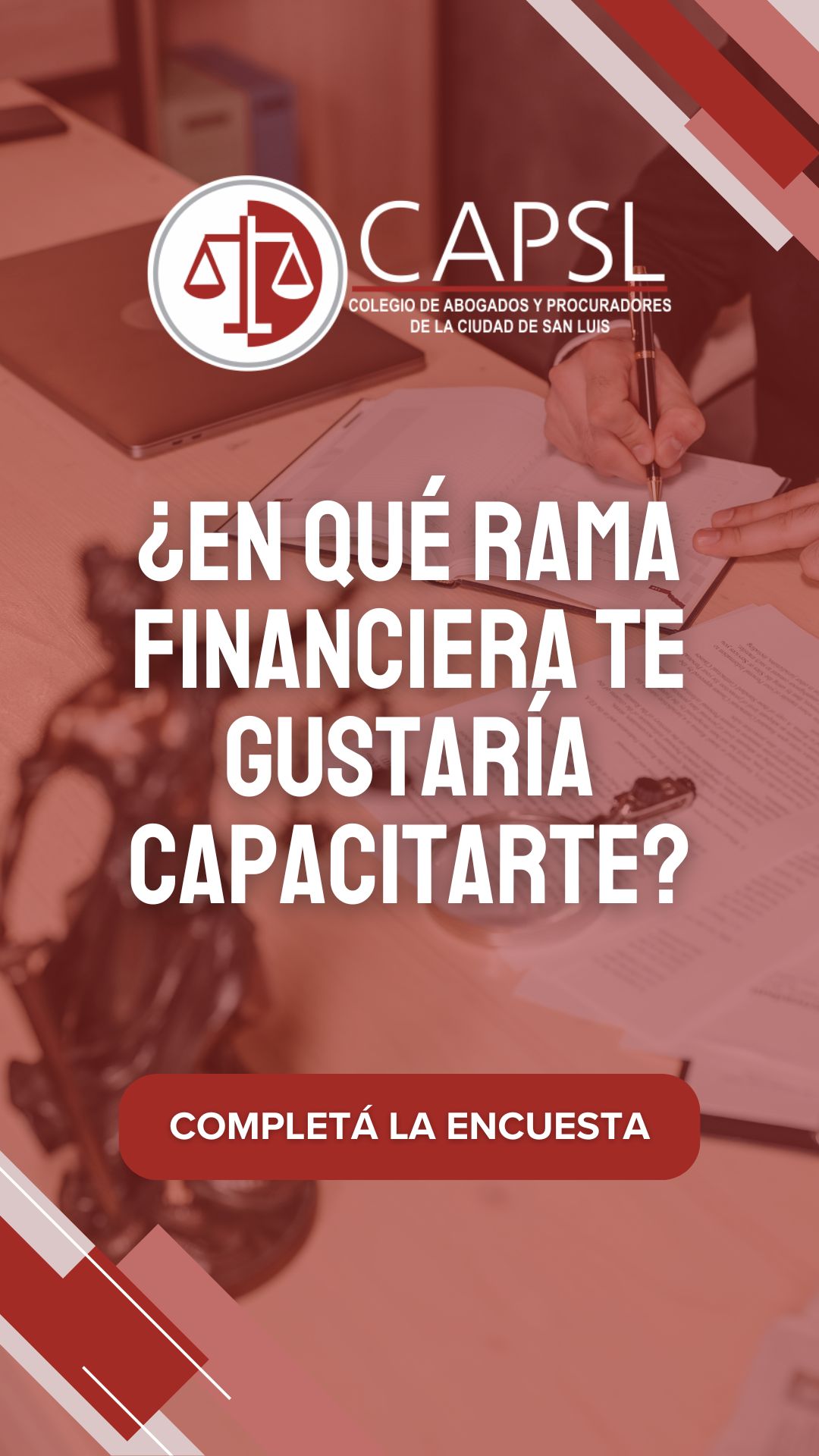 Noticias Encuesta: Capacitación Financiera Comunicacion CAPSL, 15 mayo, 2025 Completa la encuesta: https://docs.google.com/forms/d/1xqf3vb6CA_0zdK8cQJrQb9xcNax35wVJGLVan3Y3Jfc/edit Previous Talleres Prácticos de Redacción Next El presidente del CAPSL visitó el Colegio San Vicente para dialogar con estudiantes sobre el rol de los abogados Related posts Noticias Eleccciones Consejo de la Magistratura: se impuso la lista Unidad Republicana Comunicacion CAPSL, 1 noviembre, 2023 Noticias Adjudicación de Lotes con Servicio a Colegiados Comunicacion CAPSL, 24 noviembre, 2023 Noticias Convocatoria para postulantes Ad Hoc al Tribunal de Ética Comunicacion CAPSL, 26 marzo, 2025 Noticias El Sijupu comunicó sus medidas de fuerza para esta semana. Comunicacion CAPSL, 5 agosto, 2024 Noticias El Dr. Gabriel Alessandro compartió un mensaje dirigido a todos los matriculados. Comunicacion CAPSL, 1 enero, 2025 Capacitaciones Jornadas “Situación de los distintos grupos vulnerables en contextos migratorios, de desplazamientos y de refugio” Comunicacion CAPSL, 20 abril, 2022