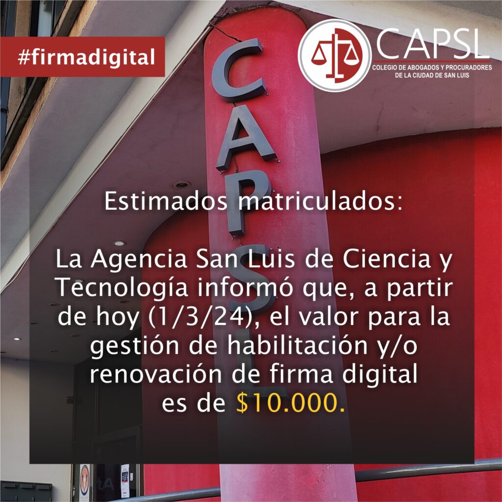 Firma Digital Nuevo valor de gestión de Firma Digital Comunicacion CAPSL, 1 marzo, 2024 La Agencia San Luis de Ciencia y Tecnología informó que, a partir de hoy (1/3/24), el valor para la gestión de habilitación y/o renovación de firma digital es de $10.000. Previous Requisitos emisión de firma digital Next Firma de Acta Complementaria con la Facultad de Ciencias Humanas de la UNSL Related posts Honorarios Nuevo valor del IUS: agosto 2024 Comunicacion CAPSL, 6 agosto, 2024 Noticias Servicio de Justicia: se llevó a cabo una reunión entre el CAPSL y el Sijupu Comunicacion CAPSL, 17 diciembre, 2021 Capacitaciones Taller de Derecho Laboral – Jornadas de Práctica de Derecho 2022 Comunicacion CAPSL, 13 junio, 2022 Noticias Diplomatura Universitaria en Desarrollos Inmobiliarios Comunicacion CAPSL, 23 marzo, 2023 Noticias A partir del 8 de agosto la recaudación de tasas judiciales será exclusivamente por Banco Nación Comunicacion CAPSL, 27 julio, 2023 Noticias Reunión con los diputados Nacionales Ernesto Alí y Zabala Chacur para reafirmar la postura en contra del divorcio administrativo Comunicacion CAPSL, 1 noviembre, 2024