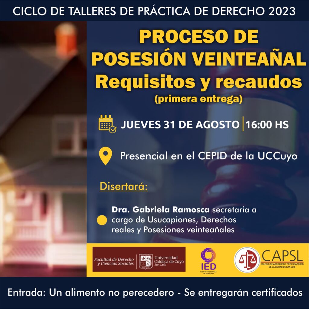 ➡️ El primer taller será “Derecho Procesal Práctico 1- Usucapiones/Posesión veinteañal: Escrito inicial y requisitos”, a cargo de la Dra. Gabriela Ramosca, secretaria a cargo de Usucapiones, Derechos reales y Posesiones veinteañales.